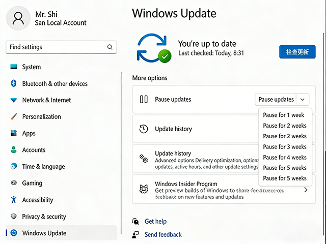 - Under More options in Windows Update, you can choose to Pause updates—with options ranging from a minimum of 1 week to a maximum of 5 weeks.