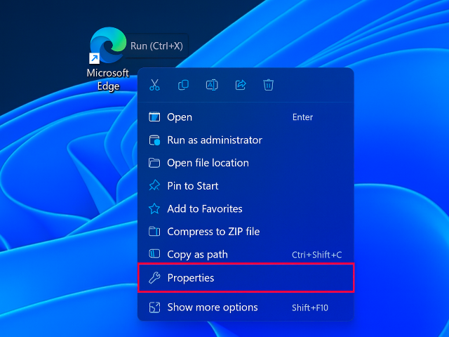 - Right-click the Microsoft Edge shortcut and select Properties. As shown in the image below: