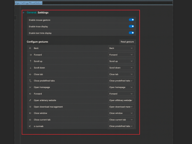 edge://settings/MouseGestureand press Enter to view or modify your mouse gesture settings. As shown in the image below: