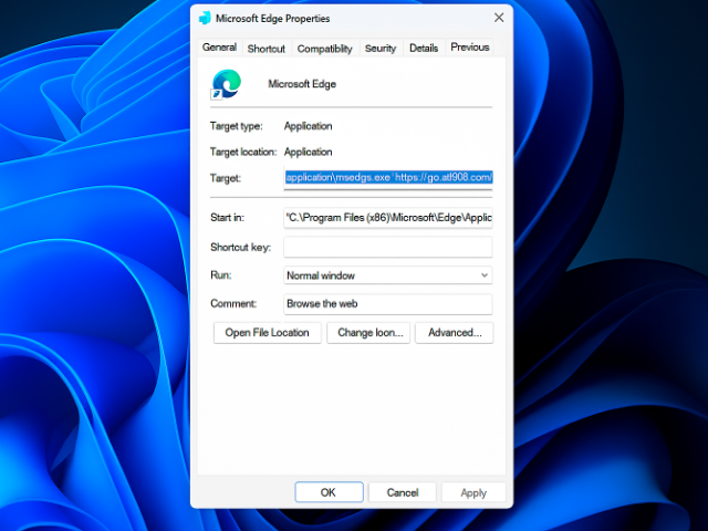 - Double-click the modified shortcut to relaunch Microsoft Edge. As shown in the image below: